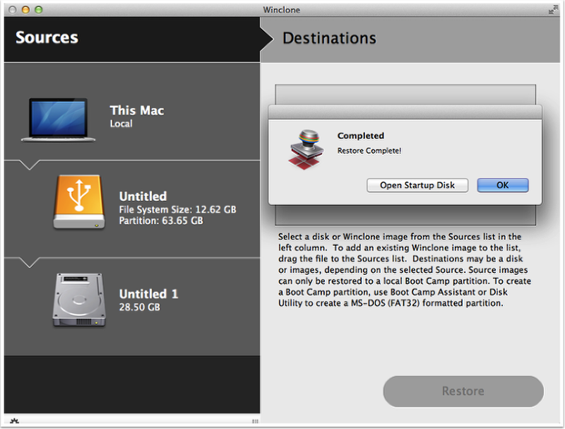 Once restoration is complete, click OK. Click Open Startup Disk and select the Boot Camp partition. Click Restart to restart into Boot Camp.